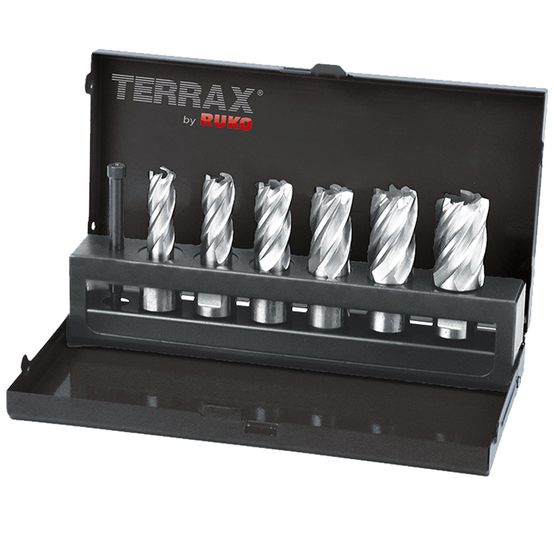 Broach Cutters/Annular Cutters/Core Drills made of heavy-duty high speed steel. Suitable for steel (such as T-brackets, large sheets), cast iron, non-ferrous and light metals.
